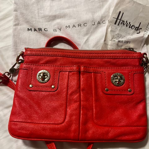 Marc Jacobs Dame Skulderveske laget i oransje lær. Vesken har en romslig innside med flere lommer, inkludert en med glidelås. Innvendig fôr i burgunder farge. Vesken har doble håndtak og detaljer i gullfarget metall.