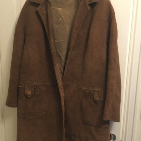Mosegrønn Alcantara damekåpe str 38.Hel lengde 118 cm.Alcantara stoff lingner på Suede.Det er uttakbar vattert for i den så den kan brukes året rundt.Kan evt.sendes med Posten.
