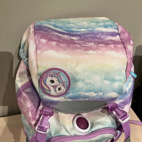 Becksöndergaard ryggsekk og penalsett laget av stoff, designet for unisex bruk. Ryggsekken har justerbare skulderstropper, flere lommer inkludert en frontlomme med glidelås, og en snoråpning øverst. Settet har en blå farge med et mønster av en fe og stjerner, og innvendig fôr med stripemønster. Passer til daglig bruk og skole.