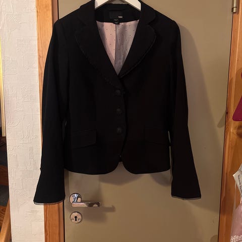 Pent brukt sort blazer fra BikBok i strl S. Blazeren har lommer og er mulighet til å brette opp ermene slik at det vises lysere stoff for en fin kontrast.