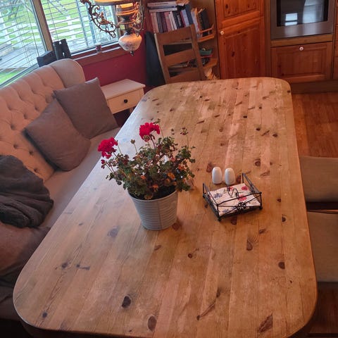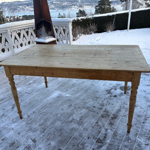 Kom med evt bud. Meget flott bord. Ca 110 år Overflaten er ubehandlet understell olje Har vært i bruk frem til nå. Satt sammen med trengsler. Rustikk, egen sjarm, hytte, hyttekos, antikk,