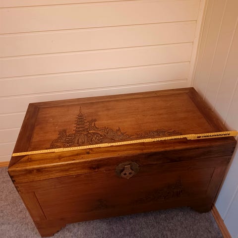 Meget fin skipskiste ca. 95 cm bred selges kr 3500. Ny pris for ca. 25 år var over kr 9000. Produser av dansk firma som hadde spesialisert seg på skipskiste