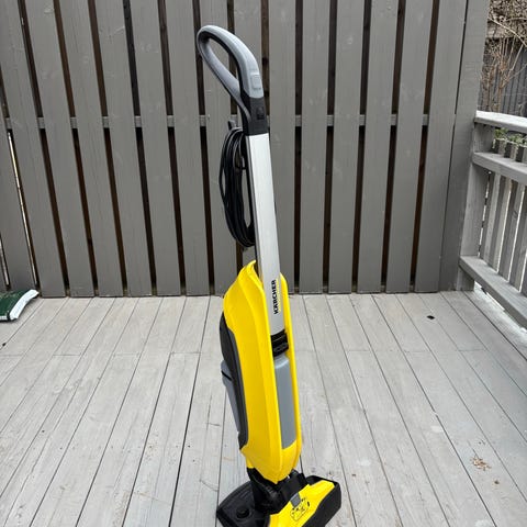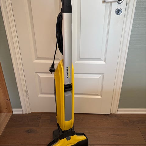 Kärcher FC 5 gulvvasker i gul og grå farge. Maskinen er designet for effektiv rengjøring av harde gulvflater med integrert vaskefunksjon. Den har et kompakt design med håndtak og ledning for enkel bruk og oppbevaring.