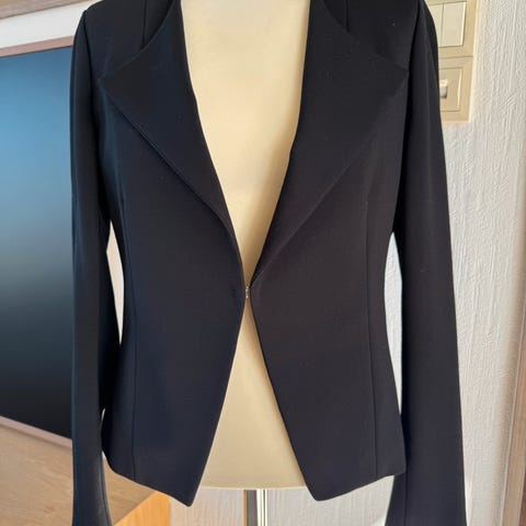 InWear blazer i svart farge. Tykt godt stoff som holder fasongennog som ikke krøller. Jakken har glidelås foran og lommer med glidelås. Jakken har et enkelt og klassisk design. Stor i størrelsen, (modellen på bildene er str 36) så jeg vil si at jakken egentlig burde vært str 36