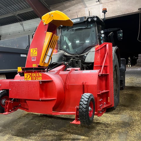 Teo kassevender brukt på gaffeltruck, ferdig tilpasset til bruk både på trucken og traktor.