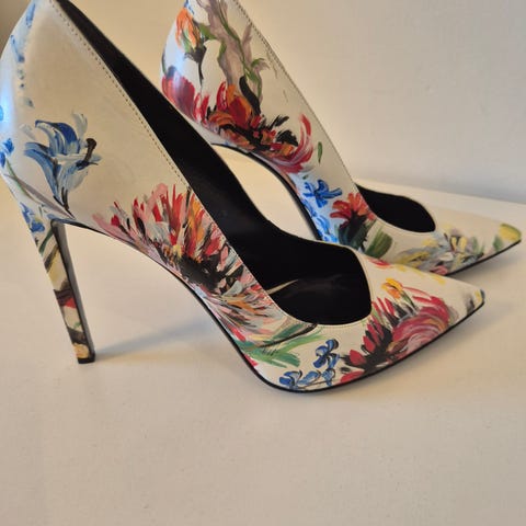Valentino hæler i svart skinn, størrelse 41 for dame. Skoene har spiss tå og dekorative nagler. Hælene er høye og smale. Brukt tilstand med synlige tegn på slitasje under sålene.