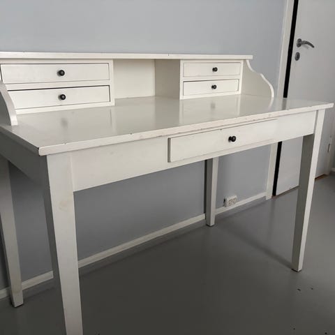 Pent brukt og solid skrivebord i lys eik og finér, med gøyale design detaljer, skuff, bok støtte og kabel skjuler. Bordet har også kabelskjulere på siden slik at det ser pent ut fra siden. Passer fint både på kontor og barnerom.