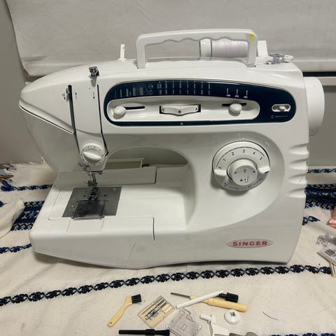 Symaskinen leies ut 100kr per dag eller 400 per uke. Leveres med noen sysaker. Saks, målebånd sprettekniv og hvit tråd.