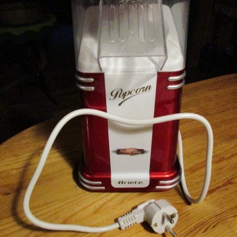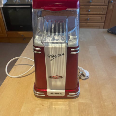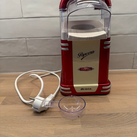 Ariete Popcorn popcornmaskin i rød og hvit farge. En elektrisk maskin designet for å poppe popcorn. Kompakt størrelse med enkel betjening, egnet for hjemmebruk.