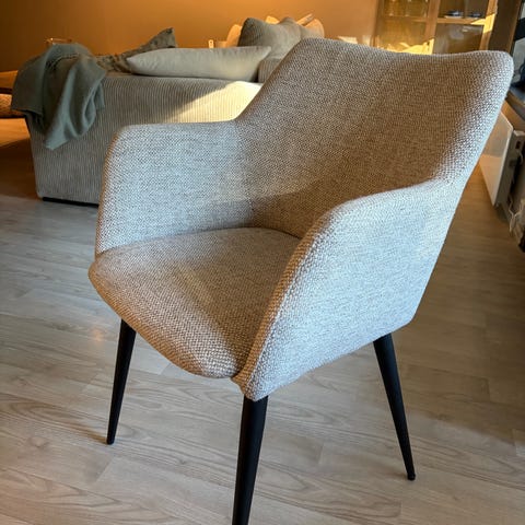 Fargen er i grå, med brune ben, rålekre og ekstremt gode å sitte i.