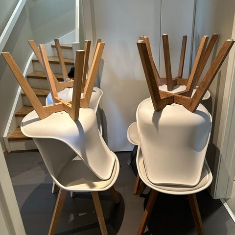 Det er noen feil på stolene - se vedlagt bilder. Men feilen nederst på det ene benet kan fikses da jeg har biten som er løs liggende(tror med litt lim er denne på plass) men dette har ikke plaget meg da det ikke syntes slik som stolene mine står nå.