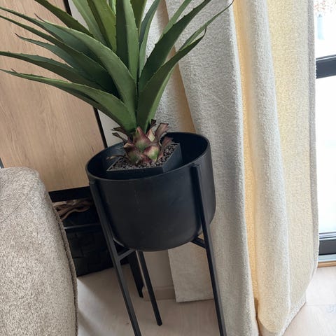 Grønn plante plassert i en grønn metallpotte med vertikale riller. En veldig vakker plante selges sammen med potten.