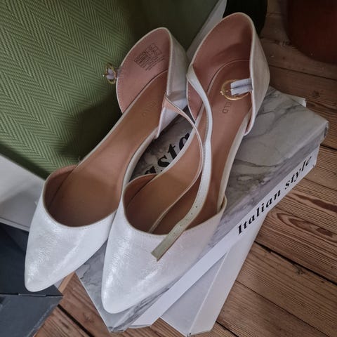Skolett i skinn med kilehæl. 8,5 cm hælhøyde. Glidelås i siden.