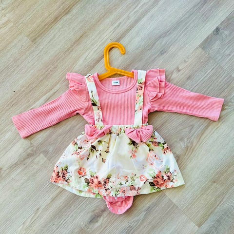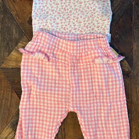 Sett med to bodyer med matchende bukse, den blå bodyen er str 68, mens den rosa bodyen og buksa er str 74, men alt er brukt samtidig! Romalige og behagelige klær, av svært god kvalitet!Alt er pent brukt av ett barn 👧🏼