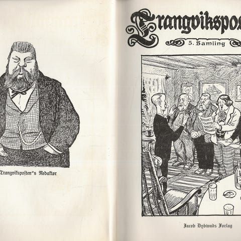 https://nn.wikipedia.org/wiki/Trangviksposten: Trangviksposten er ei fiktiv lokalavis som kjem ut i det like fiktive Trangvik. I dette verket skapte forfattaren og journalisten Jacob Hilditch eit persongalleri og lokalsamfunn med avgrensa horisont og sjølvgode haldningar overfor omverda. Satiren og humoren i verket grip tak allmennmenneskelege svakheiter, og har derfor relevans langt utover lokalsamfunnet sine grenser. Halvdan Hydle har formulert det slik: [Trangviksposten er] en parodi ikke bare på en småby, men på republikker og kongeriker. Jacob Hilditch heldt konsekvent på å vere anonym, og det var berre Bjørnstjerne Bjørnson og eit fåtal personar i presse- og forlagskretsar i Oslo som kjende til kven som stod bak føljetongen i Aftenposten. Etterkvart som Hilditch forstod at Trangvikposten vart verdsett og var godt omtykt, sørgde han for at episodane vart samla i bokform. Den sentrale figuren i Trangviksposten er redaktør Syvertsen. Han fører pennen i dette fiktive organet, og avslører seg som uskikka både som skribent og redaktør. Slik vert han ståande som eksponent for det meste av det Jacob Hilditch ville blottstille av sjølvgode haldningar, manglande samfunnsmoral, dumskap og generell vankunne. Jacob Hilditch seier sjølv dette om redaktøren: En helt ut ansvarsløs figur. Et latterlig billede av en person som aldri burde få stelle med penn og blekk, endsi ha typer, sværte og trykkpapir til sin rådighet. Andre sentrale figurar i Trangviksposten er Rheder Jørnsen, ekspeditør Erlandsen, politi Fladnes senior og junior, telegrafbestyrer Berg, fotograf Hårby, Bergthora og d'herrer brødr. Markussen. Trangviksposten er rikt illustrert av fleire velkjende, norske teiknarar. Olaf Gulbransson var den som i samarbeid med Hilditch skapte dei sentrale figurane og illustrerte den første bokutgåva. Theodor Kittelsen og Øyvind Sørensen vidareførte Gulbransson sine figurar, men skapte òg eigne, men meir perifere figurar i Trangvik. Trangviksposten ligg føre i sju bind på ulike forlag som Gyldendal, Jacob Dybvad og Grøndahl og Søn. Bøkene vert rekna for å vere eit sentralt verk i norsk humoristisk og satirisk litteratur, og er i dag, i tillegg til bibliotek og antikvariat, også tilgjengelege digitalt frå Nasjonalbiblioteket.