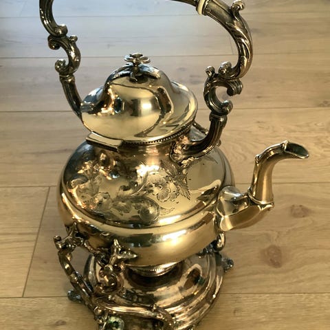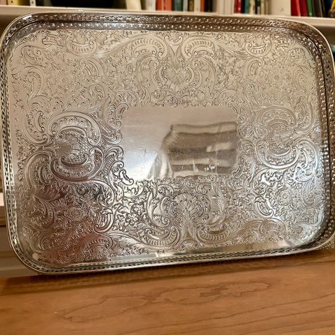 Selger et dekorativt fat i sølvplett med gravert mønster og bølget kant. Fatet står på fire små ben, som gir et elegant løft og gjør det til et blikkfang på bordet. Passer både til servering av kaker, frukt og ost, eller som dekorfat med lys og blomster. Ukjent alder.
