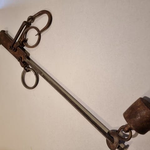 Antikk bismervekt (slutten av 1800-tallet – begynnelsen av 1900-tallet). Trolig et tidlig modell som har blitt laget av Den Norske Vektfabrik som ble grunnlagt i 1874. Laget av smidd jern med messinglodd. God stand for alderen, mekanismen fungerer.