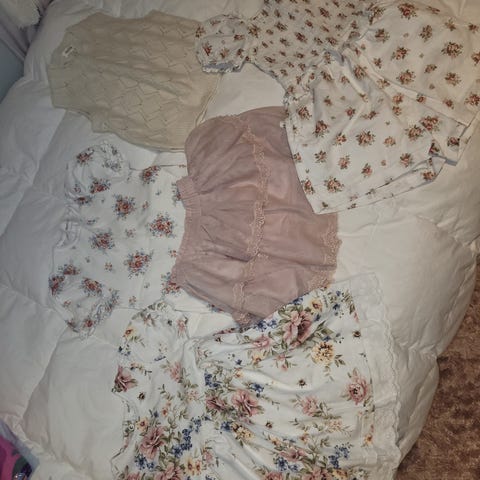 Selger en pakke med kjoler og skjørt til jente. Det er godt brukt, men er mye bruk igjen, noe flekker på et par av de ( se bilde av kne på buksedress f.eks ). Her er mange deilige sommerkjoler til barnehagebruk utover vår/sommer/høst.