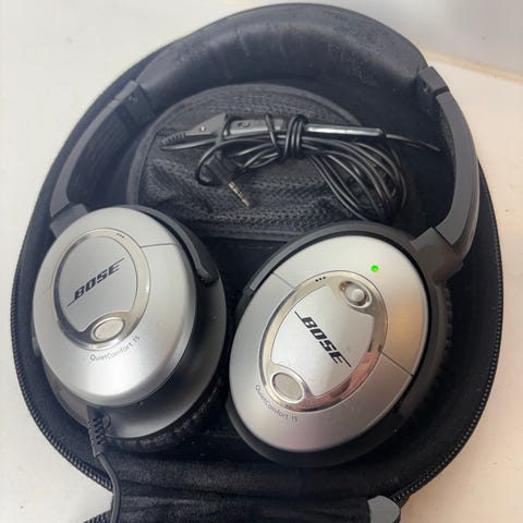 Bose quietcomfort hodetelefoner i sølvfarge. Designet for å redusere omgivelsesstøy med aktiv støydempingsteknologi. Kablet tilkobling