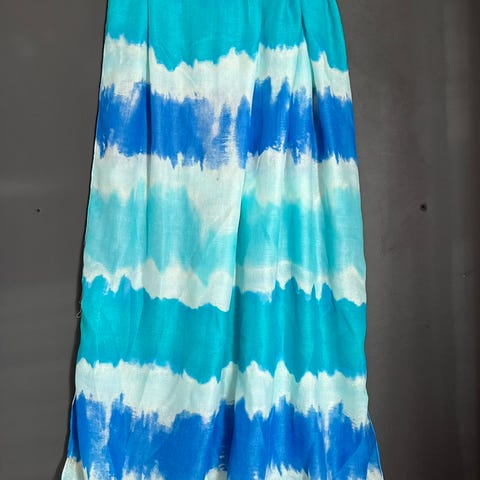 Langt bomullsskjerf med batikkmønster i blågrønn og hvit som kan brukes på mange måter. Små pompongkvaster kanter endene av skjerfet. Merk at forsiden av skjerfet har mønsteret i detaljer, mens baksiden er mørkere og mønsteret er mindre tydelig, fordi det er batikk.