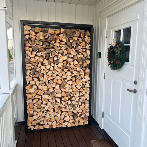 Vegghengt vedhylle. Diameter 70 cm. Dybde 20 cm. Avstandsstykke til vegg 5 cm .