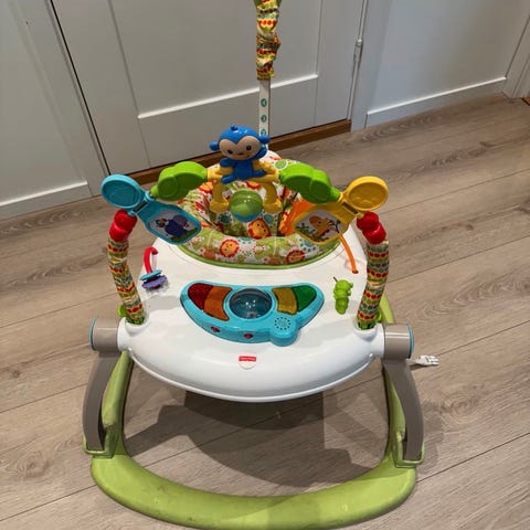 Fisher-Price aktivitetsleke for barn med flere festede leker og speil. Produktet har en rund ramme med støtteben og en sentral sitteplass for barnet. Passer for små barn og gir mulighet for lek og motorisk stimulering.