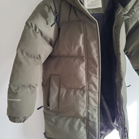Twentyfour Vinterjakke for barn i størrelse 164, farge grønn. Jakken er designet for jenter og har en polstret, isolerende konstruksjon med hette. Den passer til kaldt vær og har glidelåslommer foran. Materialet er egnet for vinterbruk og gir god beskyttelse mot vind og kulde. Jakken er ubrukt,
