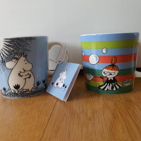 Utgåtte mummikopper «Måneskinn» (2021) og «Stinky» (2001-2021) selges samlet til kr 849. De er i perfekt stand, ubrukte med etiketter. De har bare stått til pynt.