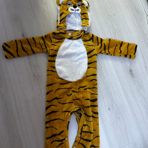 Barnedrakt/kosedress med tigermønster i flerfarget design. Passer til barn i størrelse 128 og er laget for unisex bruk. Heldrakten har hette med ører og er laget av mykt materiale.