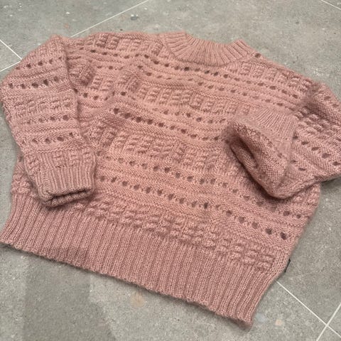 Str XS - romslig i str. jeg bruker vanligvis s/m og denne passer meg fint. 100% ull. Med lett pufferm på skulderen. Kjempe fin genser. Kan sendes mot frakt.