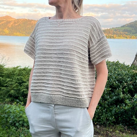 Poppy tee fra Petiteknit strikka i sunday (merinoull) og alpakka følgetråd (100% alpakka). Selges fordi den blei litt for liten for meg.