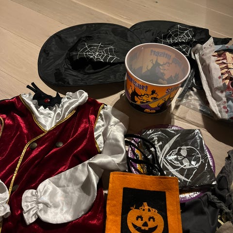 Størrelser fra 3 -7 år. Flere unisex Halloween kostymer i ulike stiler og farger. Kostymene inkluderer blant annet en drakt med røde, grå og blå farger med vide ben, en fargerik skjelettdrakt med hansker, et mønstret plagg med oransje og svarte toner, en kappe med rødt og svart mønster, samt en svart drakt med gult emblem. Materialene varierer, og kostymene er designet for bruk ved Halloween eller temafester.