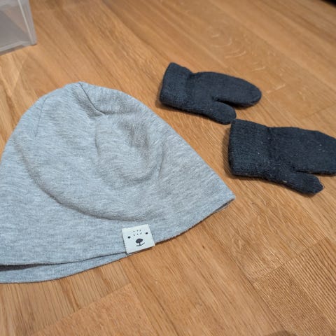 Søtt sett med votter og lue med bamser på, ingen merker, flekker eller hull. Selges samlet.