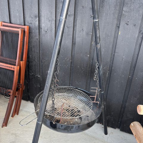 Grillen har to sidebord, tre brennere og hjul for enkel flytting.