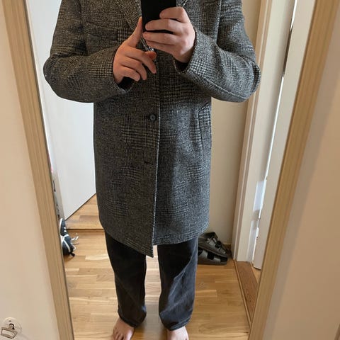 Hei! Jeg selger en fin og varm kåpe fra Hugo Boss i størrelse 48. Jeg har brukt den alt for lite (maks ti ganger), og håper en annen kan få glede av den. Yttermateriale: 40% ull, 10% viskose, 50% polyester. Innsiden: polyester og viskose.