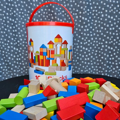 Selger pent brukte byggeklosser i tre. 100 deler totalt. Fin treleke som kan bygges på mange ulike måter.
