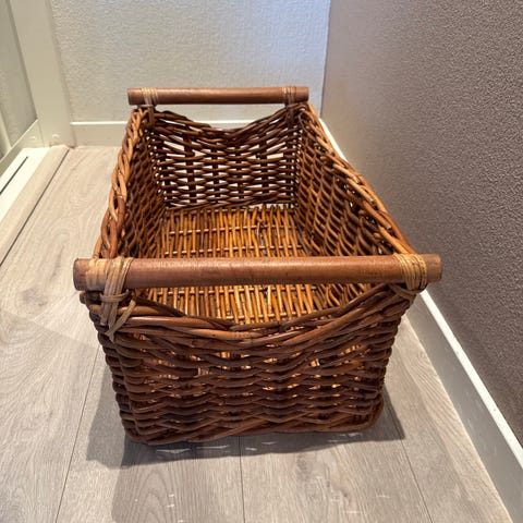 Perfekt til oppbevaring av ved, leker, strikketøy osv. fra håndtak til håndtak er det 39 cm. Må hentes.