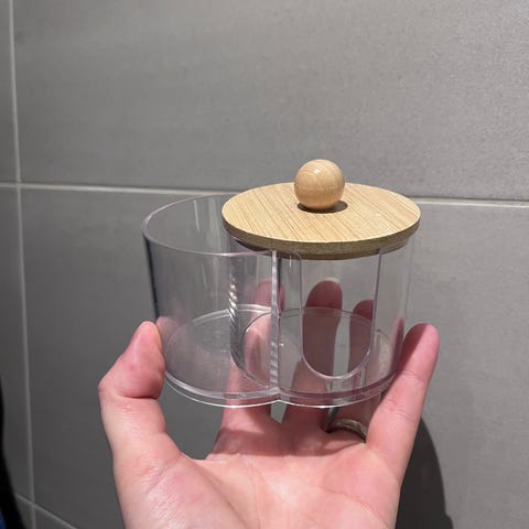 Oppbevaringsboks med speil i beige med flere rom for organisering. Fra IKEA, brukt til oppbevaring av sminke.