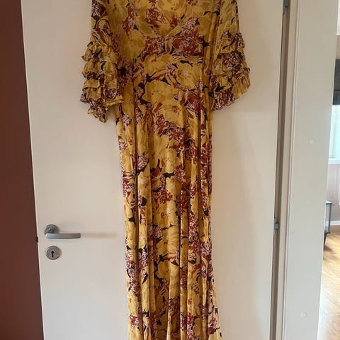 Nydelig kjole fra By Timo selges; Rosa print, fast underkjole, ankel-lang, søte puffermer 🌸 Veldig behagelig på. Fast belt som sitter litt høyt gir en flatterende fasong. Kjolen er brukt et fåtall ganger, og den er nyrenset.