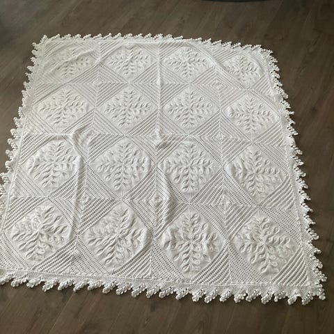 På bildet ligger det på en seng med bredde 120 cm. Passer også til smalere senger, da henger det ned på sidene. Dette er ett håndheklet sengeteppe fra tidlig 70-tallet. Turkis farge.