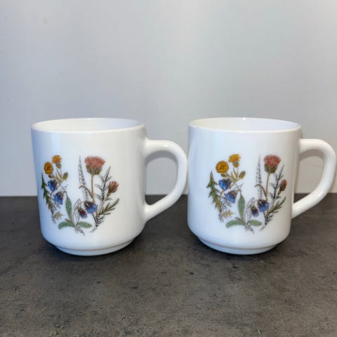 Krus i opalinglass med maritimt design. Fra Arcopal. Krusene er 9 cm høye og rommer ca 3dl fulle til kanten. Antall er 4 stk, alle er pene I dekoren. Ingen skader.