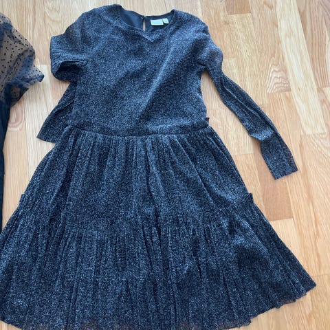 Cubus barn kjole i størrelse 128 for jenter. Kjolen er svart og har kort erm. Overdelen har et strukturert mønster, mens skjørtedelen er laget av et lettere, flytende materiale. Kjolen har glidelås bak for enkel påkledning.