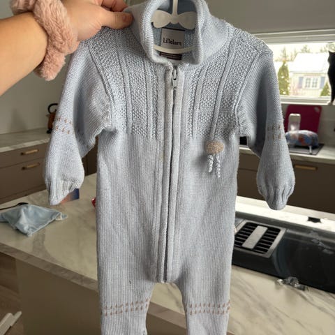 Et par små hull på genseren og ulldressen, og noe misfarging i halsen på bodyen.