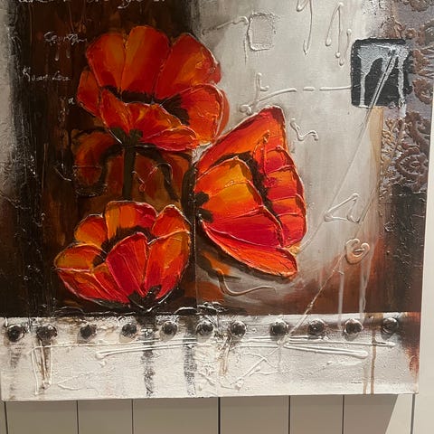 Håndmalt maleri (30x40 cm)som viser et strandmotiv med blått hav, hvite bølger og en himmel med skyer og fugler. Maleriet har en rolig og naturlig fargepalett med nyanser av blått, hvitt og beige. Passer til dekorasjon i hjem eller kontor.