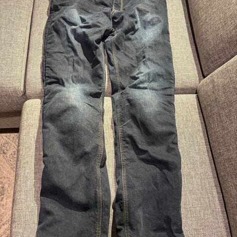 Sweep Jeans KJRN bukser i mørk blå denim, størrelse W30 L32, designet for herre. Laget av 97% bomull og 3% elastan for fleksibilitet og komfort. Produktet har forsterkede områder og mesh-foring, egnet for motorsykkelbruk med CE-godkjenning. Laget i Pakistan.