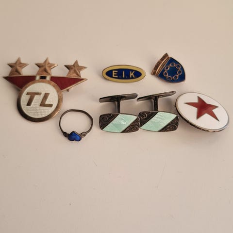 Pin/jakkenål i sølv med emalje fra finske Kultaseppa. Eller det er det jeg tror og har klart å finne ut om mesterstempelet.