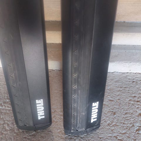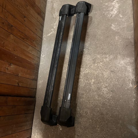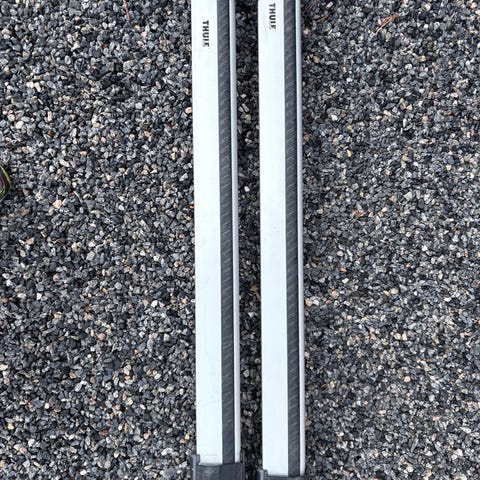 Thule WingBar Edge taksystem i aluminium med sølvfarge. Passer til montering på taket av biler for transport av last. Inkluderer to stenger og monteringsfester. Designet for å være aerodynamisk og redusere vindstøy.