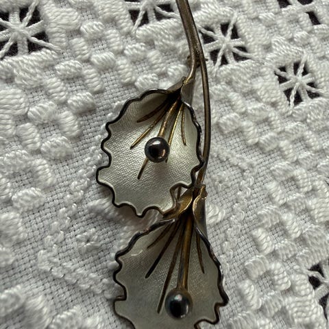 Nål i oksidert sølv formet som blomst, i god stand. Stemplet 830 S. Sikkerhetslås på låsen. Ca. 5 cm lang.