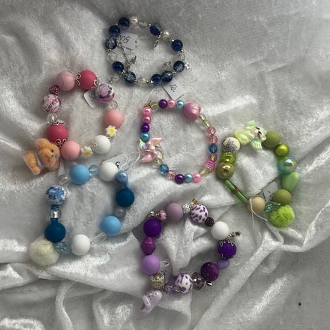 Håndlaget perlearmbånd med blomster i rosa/hvitt.