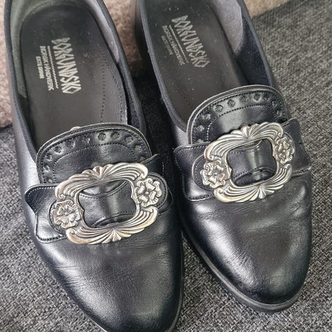 Mokkasiner og båtsko i størrelse 44. Skoene er laget av svart skinn og har en klassisk design. Egnet for formelle og uformelle anledninger. Skoene er merket str 45, men de er så små i numrene at str 44 er mer riktig.